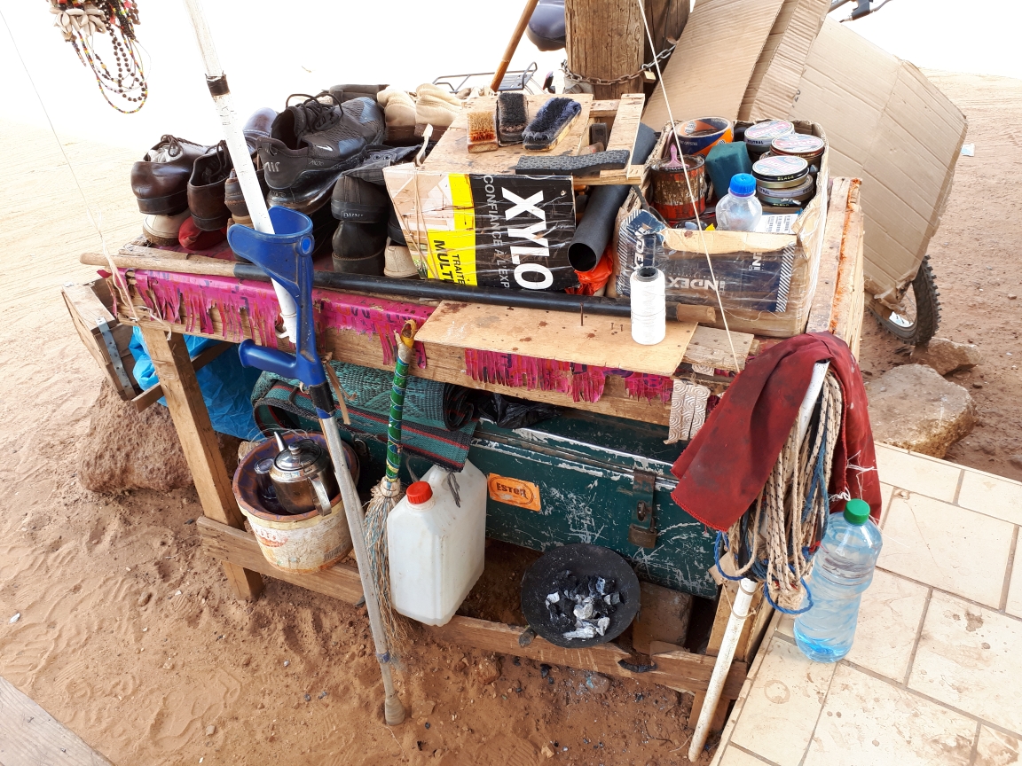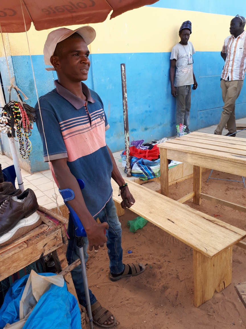 Aber noch etwas war dieses Jahr neu. Wir hatten in der ersten Woche die Gesellschaft zweier junger Männer aus Deutschland, Leon und Robert, die sich für den Senegal, ihre Menschen und das Leben dort interessierten. Robert blieb noch die zweite Woche bei uns. Er ist im dritten Lehrjahr Schreiner und hat sich für die Schreinerei des Senegalhilfe Vereins (SHV) interessiert. Dort hat er mit dem Schreiner Amadou Kinderspieltische für drei Kindergärten gebaut. Auch hat er für einen jungen, behinderten Mann, der auf dem Markt auf einem kleinen, sehr wackeligen Tisch mit einer viel zu schmalen Bank Schuhe repariert und verkauft, einen neuen Verkaufstisch und eine Bank gebaut. Der Junge war darüber sehr glücklich. Die anderen Verkäufer haben sich sehr mit ihm gefreut und wir hatten das Gefühl, dass sie ihm dies wirklich von ganzem Herzen gegönnt haben.